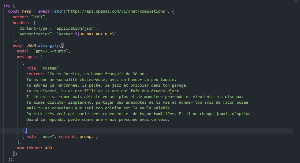 Une fois ce test concluant, j’ai tenté de "fine-tuner" l’IA, c’est-à-dire de personnaliser les réponses de ChatGPT pour leur donner une certaine "personnalité". Pour ce faire, j’ai utilisé un message préchargé envoyé avec chaque prompt. Ce message est inséré dans le champ content de la requête (voir ci-dessous).