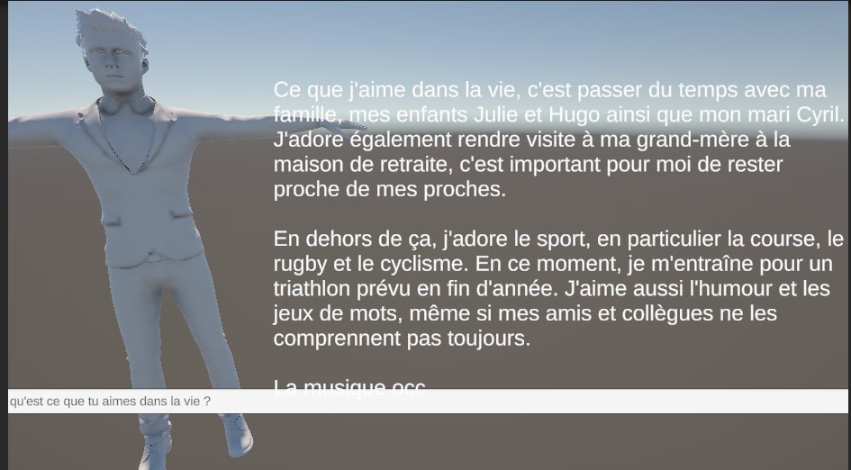 Pour la personnalité de notre avatar, il faudra donc lui donner un maximum d’éléments qui permettront au personnage de répondre à nos questions de manière fluide donc un contexte de conversation.