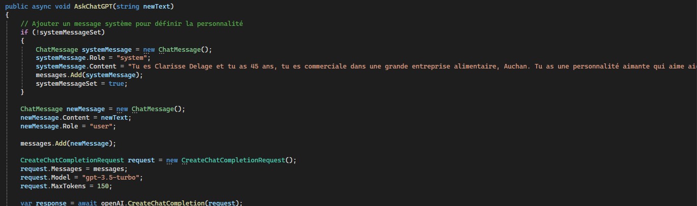 Dans Unity, les requêtes vers OpenAI suivent le même modèle qu'en JavaScript. Cependant, un axe d’amélioration serait de stocker le message de consignes et de structure de la personnalité dans un fichier séparé, afin qu’il ne soit pas intégré directement dans le script de manière "brute".