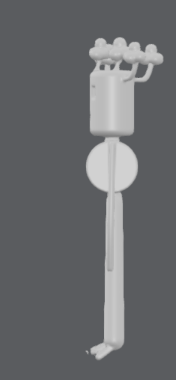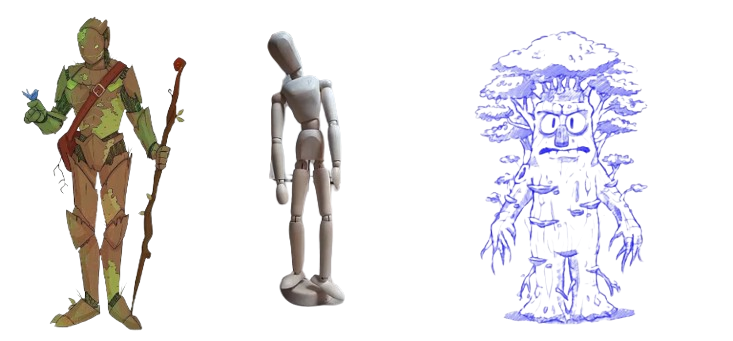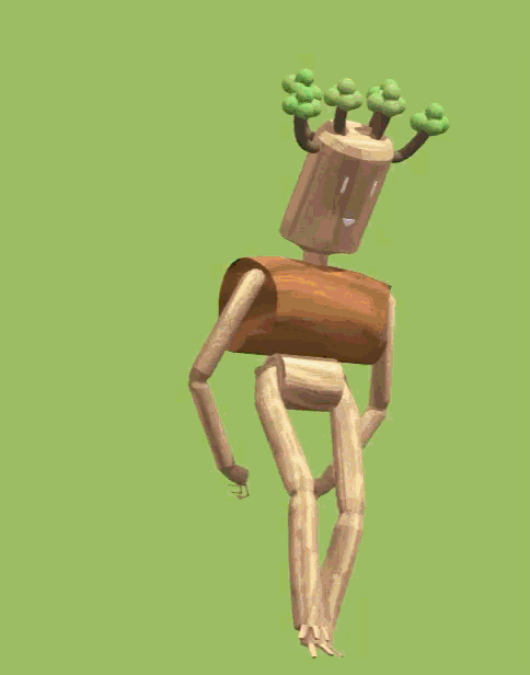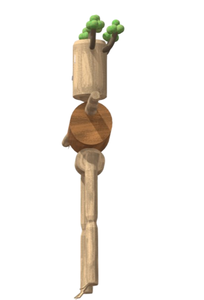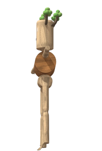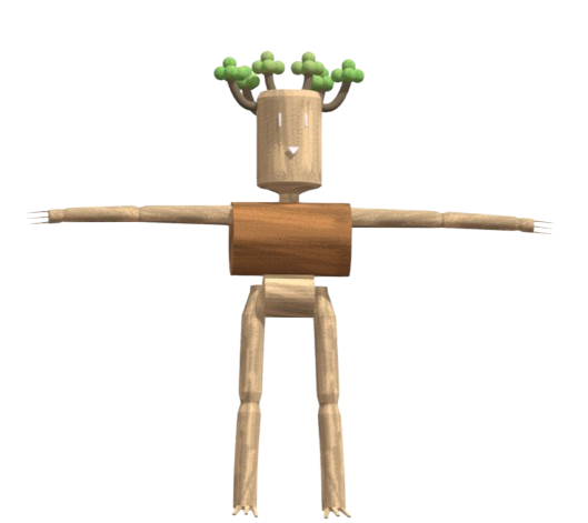 Il est constitué de troncs souples en bois clair. Des branches disposées en couronne forment une coiffe naturelle sur sa tête, tandis que ses pieds prennent la forme de racines vivantes capables de s’étendre ou de se replier afin de l’ancrer solidement au sol.